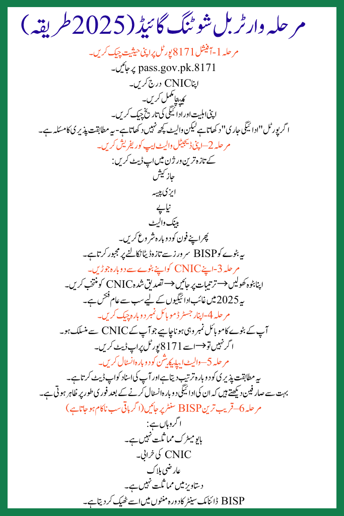 | CNIC not verified | Visit BISP office → Re-verify biometrics |