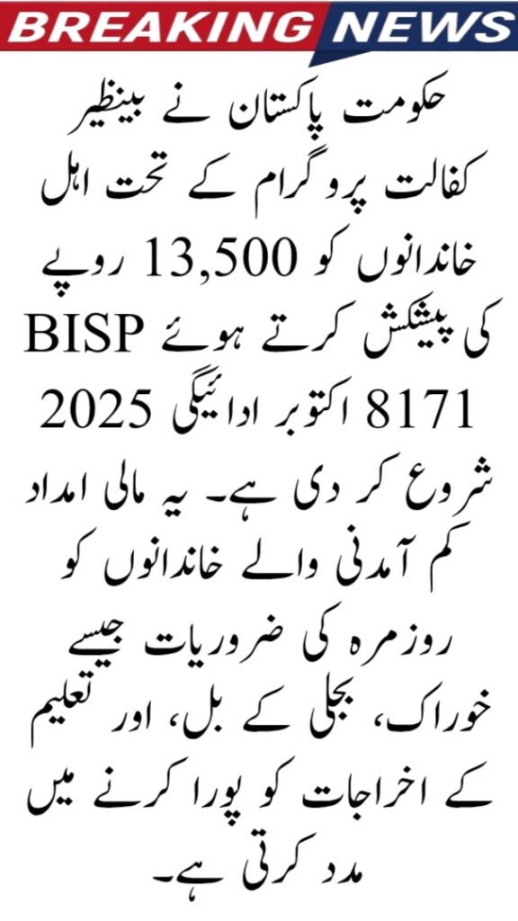 The Benazir Income Support Programme (BISP) is a welfare scheme to help poor and needy families in Pakistan. The October 2025 payment of Rs 13,500 is part of the regular installment given to registered families.
