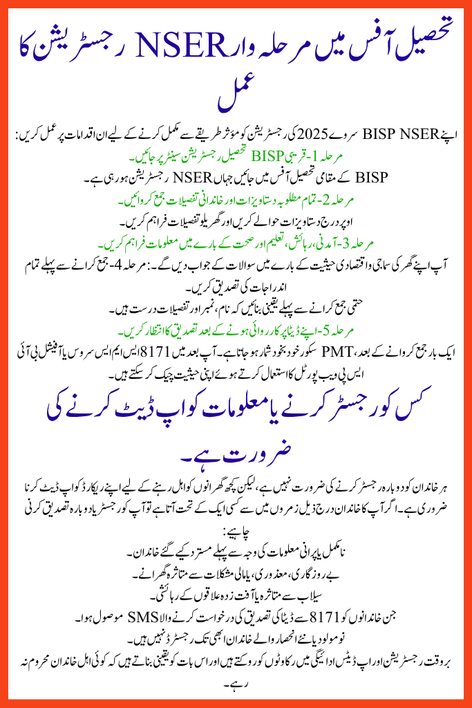 If you are applying for BISP support for the first time, you must register under the NSER Survey to be considered for the Benazir Kafalat Program. Visit your nearest BISP Tehsil Office and provide complete household information.