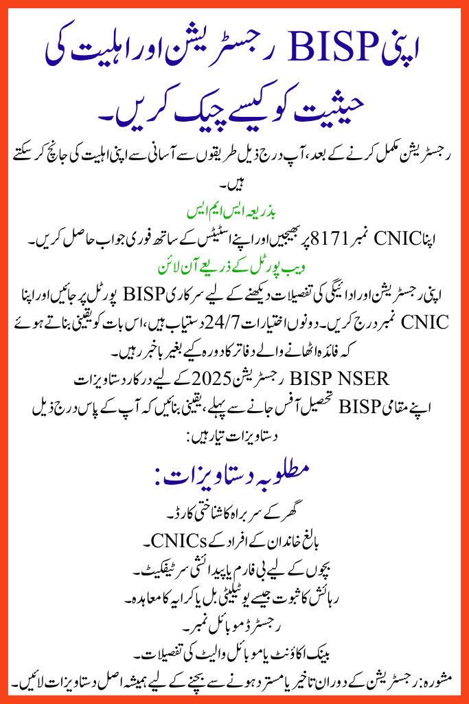 | NSER Survey 2025 / BISP Registration | June 2025 (roll-out) | June 30, 2025 (deadline) | Rs. 13,500 quarterly payment | Visit local BISP Tehsil Office (offline registration) |