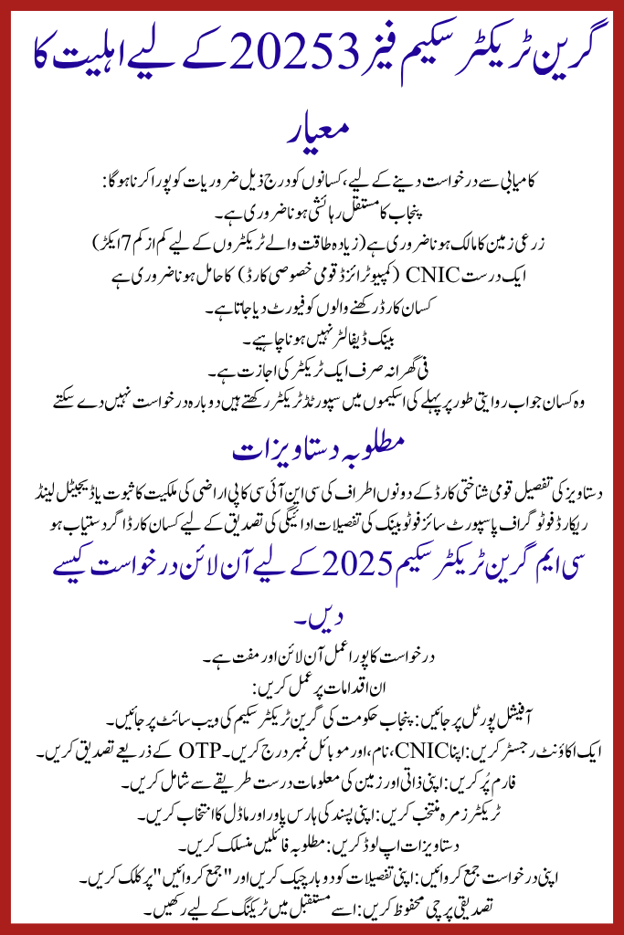 The CM Green Tractor Scheme Phase 3 2025 is a golden opportunity for Punjab’s farmers. With a subsidy of up to PKR 1 million, transparent selection, and an easy online application process, this program helps farmers modernize their farms, cut costs, and increase productivity.