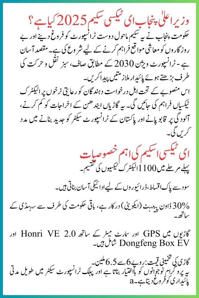 Under this plan, electric taxis will be provided at subsidized rates to qualified applicants. These vehicles will help reduce fuel costs, curb pollution, and modernize Pakistan’s transport sector.