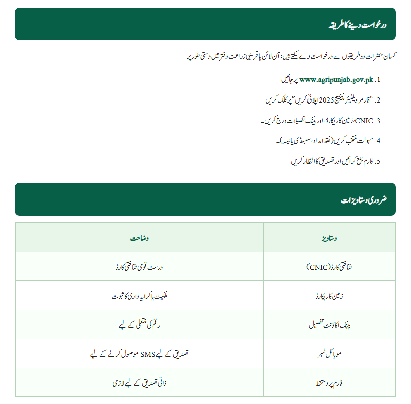 Farmers who are residents of Punjab, have a valid CNIC, and own or rent agricultural land can apply. Small and medium farmers will get priority.