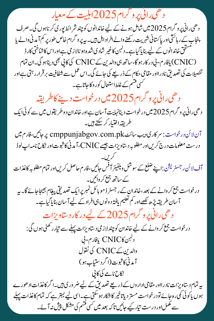 To join the Dhee Rani Scheme 2025, families must encounter certain rules. Only publics of Punjab with Pakistani nationality are eligible. The database is destined for low-income or deserving families. The bride must be single, and her CNIC or Form-B is obligatory, along with CNICs of dads. The rule will verify these details complete NADRA and family powers that be. This development ensures fair-mindedness and thwarts ill use. These simple admissibility ladders make sure that only truly justified descendants get wedded with self-respect through this rule ingenuity.