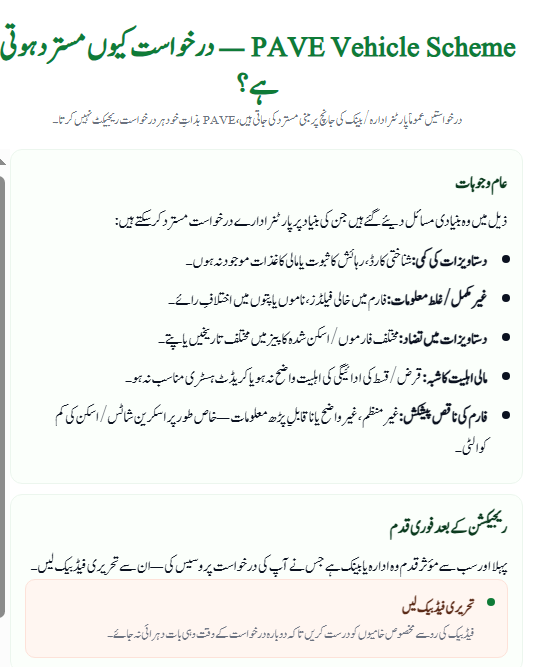 Applicants often feel confused when their request is denied. The truth is, PAVE Vehicle Scheme rejections come from banks or partner institutions—not from PAVE itself. The most common reasons include: