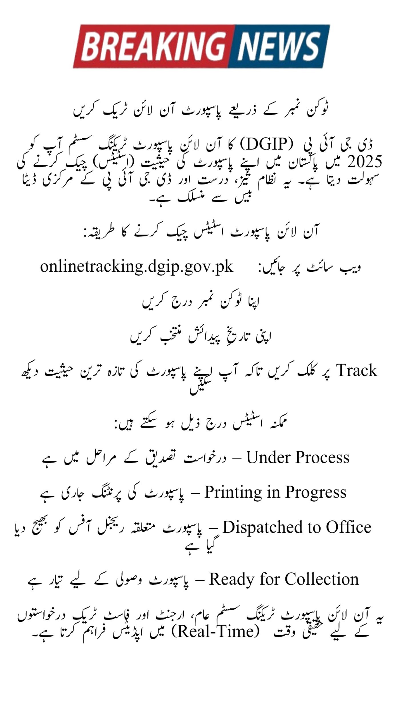 The process of passport tracking in Pakistan 2025 has become faster and easier than ever. The Directorate General of Immigration and Passports (DGIP Pakistan) has digitized its entire tracking system. Applicants can now track passport by SMS, online portal, or token number within seconds. Whether you applied for a normal, urgent, or fast-track passport, this system ensures you stay updated without visiting any passport office.Every applicant receives a tracking token number after applying, which helps monitor the passport application status from submission to delivery. The latest DGIP digital upgrade has made the process transparent for all Pakistanis.
