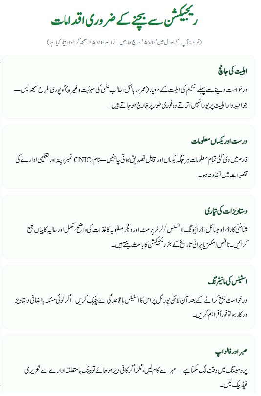 The most common reasons are missing documents (like CNIC, domicile, or learner’s permit) and inaccurate or inconsistent information in the application.