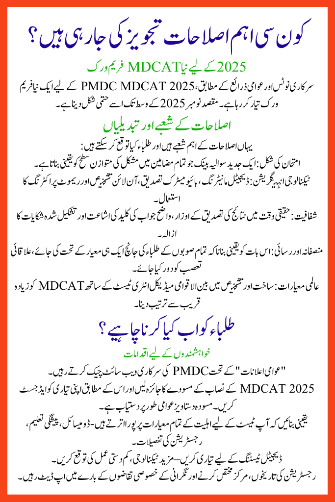 MDCAT Reform Framework 2025Started 2025 (Committee formed Nov)Framework expected by mid-November 2025Modernised syllabus, fairer question-bank, digital monitoring, transparency toolsVia official PMDC portal / University Testing Centres