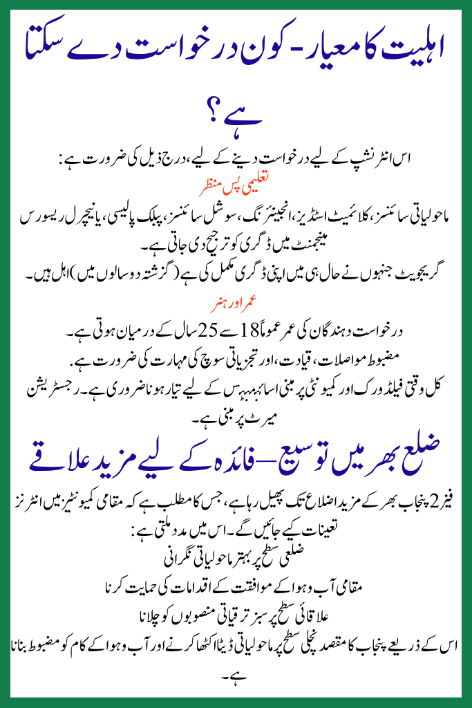 In response to growing climate risks and environmental challenges, the Punjab Government has hurled Phase 2 of its Climate Leadership Development Internship Program. This internship aims to build a new cohort of green leaders by training young graduates in climate change science, environmental policy, and research — all while providing a modest once-a-month stipend. By the end of this package, Punjab hopes to must a skilled adolescence workforce ready to lead climate pliability initiatives across the province.