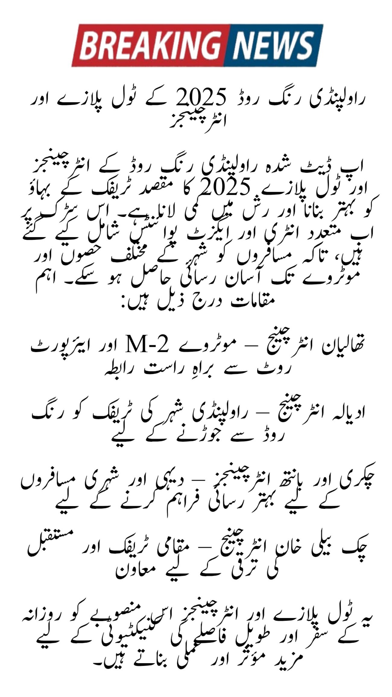 The updated Rawalpindi Ring Road Interchanges and Toll Plazas 2025 are designed to improve traffic flow and reduce congestion. The road will now feature multiple entry and exit points, making it easier for commuters to access different parts of the city and motorway. Key locations include: