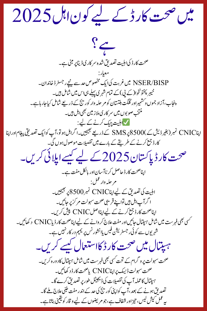 The Sehat Card Pakistan 2025 is more than just a piece of plastic — it’s a lifeline for millions of Pakistanis. It gives families hope, financial relief, and access to healthcare when they need it the most.