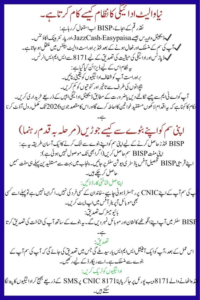 In 2026, BISP is moving to a wallet-based payment system. This means beneficiaries will get their quarterly financial assistance directly into a digital wallet account linked to their mobile number. To make this possible: